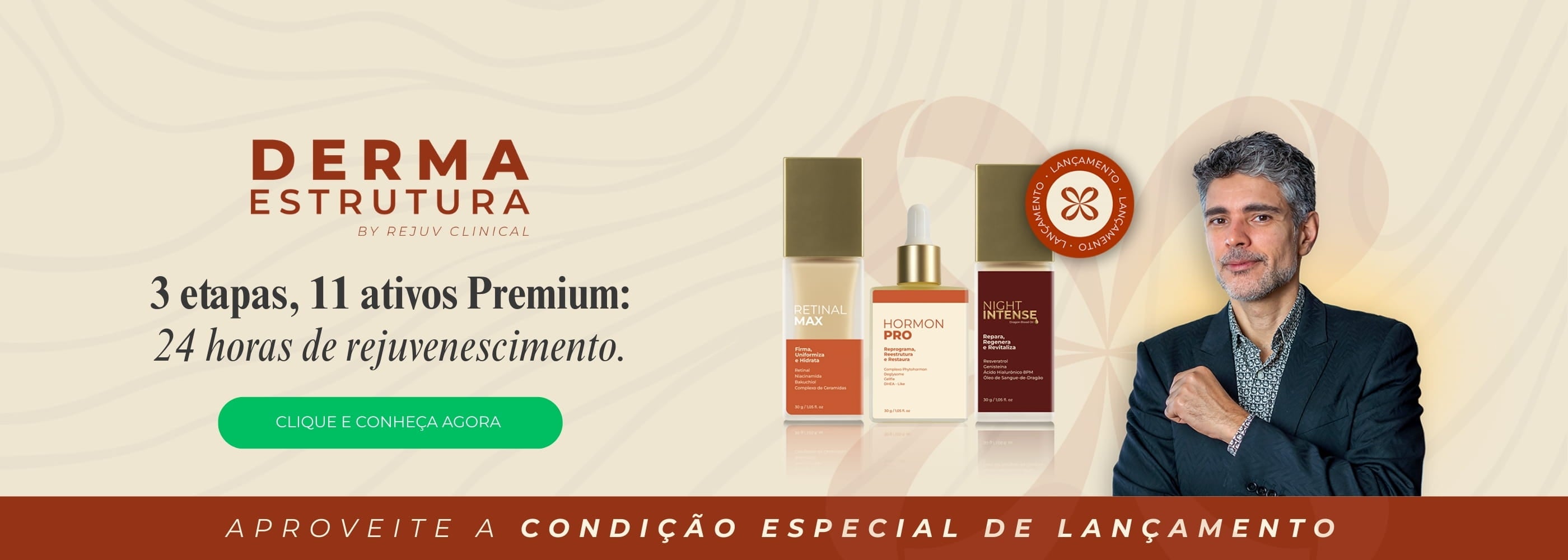 Protocolo completo de rejuvenescimento em 3 etapas para a pele madura. Desenvolvido sob curadoria do Dr. Jardis Volpe, o Dermaestrutura atua em sincronia com o ciclo biológico da sua pele — estimulando de dia e regenerando à noite.